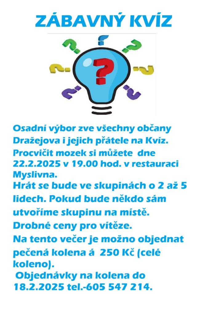 Zábavný kvíz – 22.2.2025 19:00 restaurace Myslivna Autor příspěvkuZdenek Příspěvek byl publikován17. 2. 2025 Rubriky příspěvkuNezařazené Komentáře k příspěvkuŽádný komentář Mohlo by se Vám také líbit Poděkování 27. 2. 2025 Druhý zábavný kvíz 21.3.2025 19:00 restaurace Myslivna 10. 3. 2025 Mikulášská nadílka 21. 10. 2024 Napsat komentář Zrušit odpověď na komentářKomentářChcete-li přidat komentář, zadejte své jméno nebo uživatelské jméno Chcete-li přidat komentář, zadejte svou e-mailovou adresu Zadejte adresu URL svého webu (volitelně) Uložit do prohlížeče jméno, e-mail a webovou stránku pro budoucí komentáře. Δ