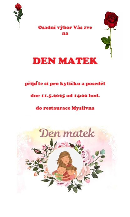 Den matek 11.5.2025 od 14:00 Autor příspěvkuZdenek Příspěvek byl publikován4. 5. 2025 Rubriky příspěvkuSpolečenské akce Komentáře k příspěvkuŽádný komentář Mohlo by se Vám také líbit Zábavný kvíz – 16.5.2025 v 19:00 v restauraci Myslivna 6. 5. 2025 Dětský den – 1.6.2025 14:00 6. 5. 2025 Zveme Vás na MÁJKU dne 30.4.2025 od 16:00 22. 4. 2025 Napsat komentář Zrušit odpověď na komentářKomentářChcete-li přidat komentář, zadejte své jméno nebo uživatelské jméno Chcete-li přidat komentář, zadejte svou e-mailovou adresu Zadejte adresu URL svého webu (volitelně) Uložit do prohlížeče jméno, e-mail a webovou stránku pro budoucí komentáře. Δ