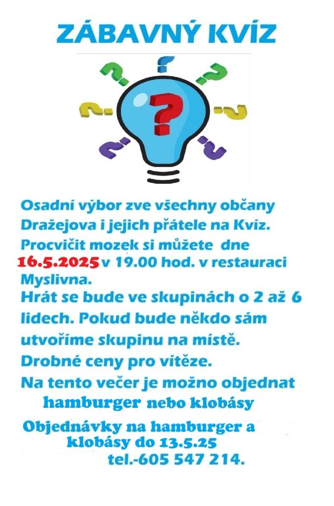 Zábavný kvíz – 16.5.2025 v 19:00 v restauraci Myslivna Autor příspěvkuZdenek Příspěvek byl publikován6. 5. 2025 Rubriky příspěvkuSpolečenské akce Komentáře k příspěvkuŽádný komentář Mohlo by se Vám také líbit Dětský den – 1.6.2025 14:00 6. 5. 2025 Zveme Vás na MÁJKU dne 30.4.2025 od 16:00 22. 4. 2025 Zabijačkové hody 2025 5. 10. 2025 Napsat komentář Zrušit odpověď na komentářKomentářChcete-li přidat komentář, zadejte své jméno nebo uživatelské jméno Chcete-li přidat komentář, zadejte svou e-mailovou adresu Zadejte adresu URL svého webu (volitelně) Uložit do prohlížeče jméno, e-mail a webovou stránku pro budoucí komentáře. Δ