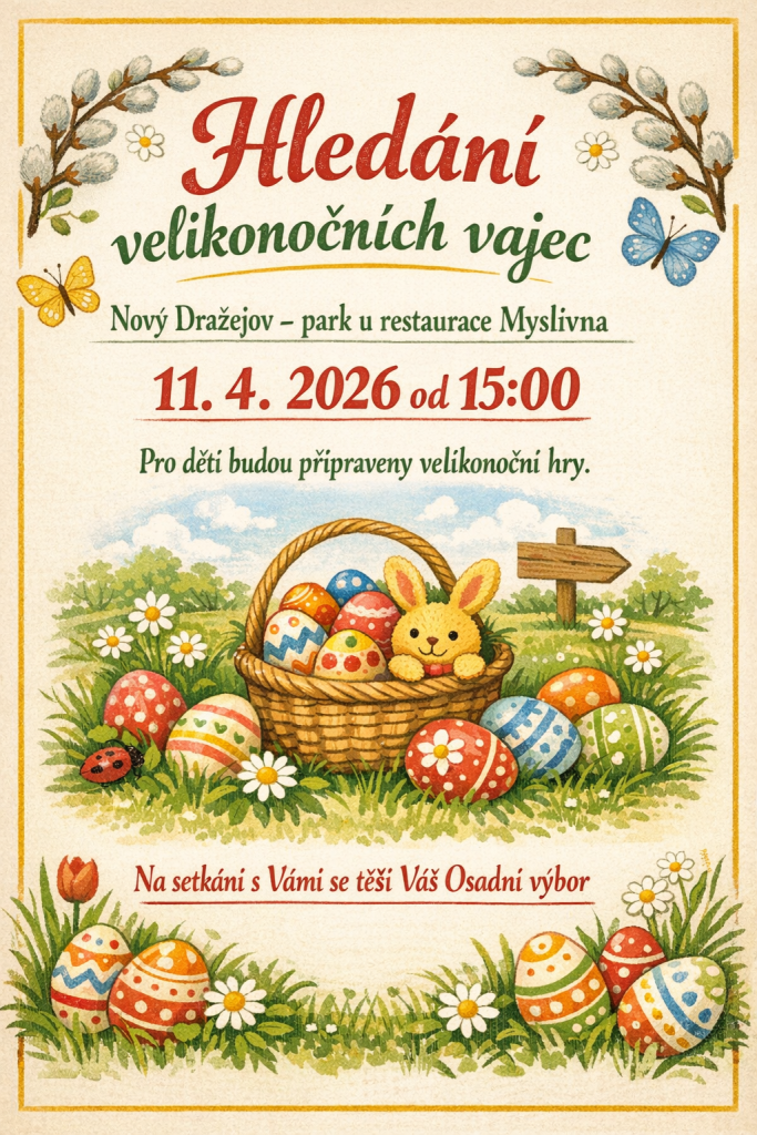 Hledání velikonočních vajec – 11.4.2026 15:00 Autor příspěvkuMichal Příspěvek byl publikován14. 3. 2026 Rubriky příspěvkuNezařazené Komentáře k příspěvkuŽádný komentář Mohlo by se Vám také líbit Petice – restaurační zařízení Myslivna 26. 9. 2024 První slavnostní rozsvícení vánočního stromku v Novém Dražejově a Virtu. 21. 10. 2024 Vyčistíme Nový Dražejov 27.3.2026 od 17:00 hod 21. 3. 2026 Napsat komentář Zrušit odpověď na komentářKomentářChcete-li přidat komentář, zadejte své jméno nebo uživatelské jméno Chcete-li přidat komentář, zadejte svou e-mailovou adresu Zadejte adresu URL svého webu (volitelně) Uložit do prohlížeče jméno, e-mail a webovou stránku pro budoucí komentáře. Δ